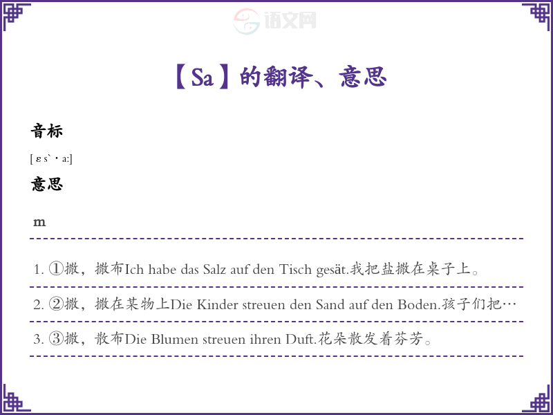 ①撒,撒布Ich habe das Salz auf den Tisch gesät.我把盐撒在桌子上。