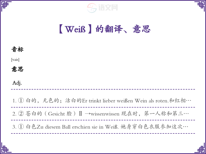 ① 白的,无色的;洁白的Er trinkt lieber weißen Wein als roten.和红相比,他更喜欢喝白。Er ist in den letzten Jahren ganz weiß geworden.最近几年来他的头发全白了。