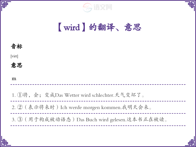 ③(用于构成被动语态)Das Buch wird gelesen.这本书正在被读。