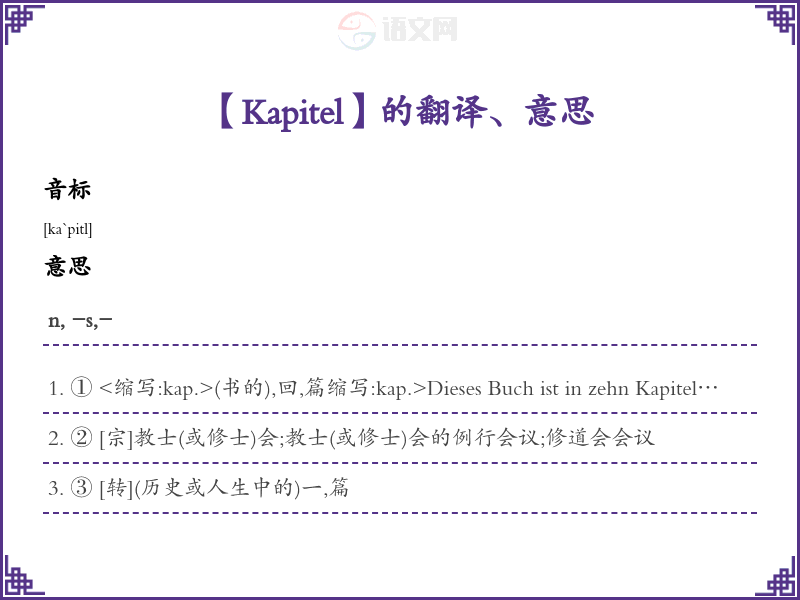① <缩写:kap.>(书的),回,篇缩写:kap.>Dieses Buch ist in zehn Kapitel eingeteilt.这本书被分为10。