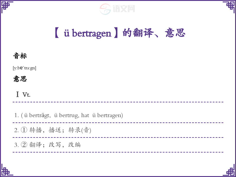 传布,传染,感染Die Tollwut kann sich auch auf Menschen übertragen.狂犬病可以传染到人身上。Ihre Begeisterung übertrug sich auf ihre Kollegen.她的热情感染了她的同事们。Ⅲ übertragen P.Ⅱ转义的,借用的
