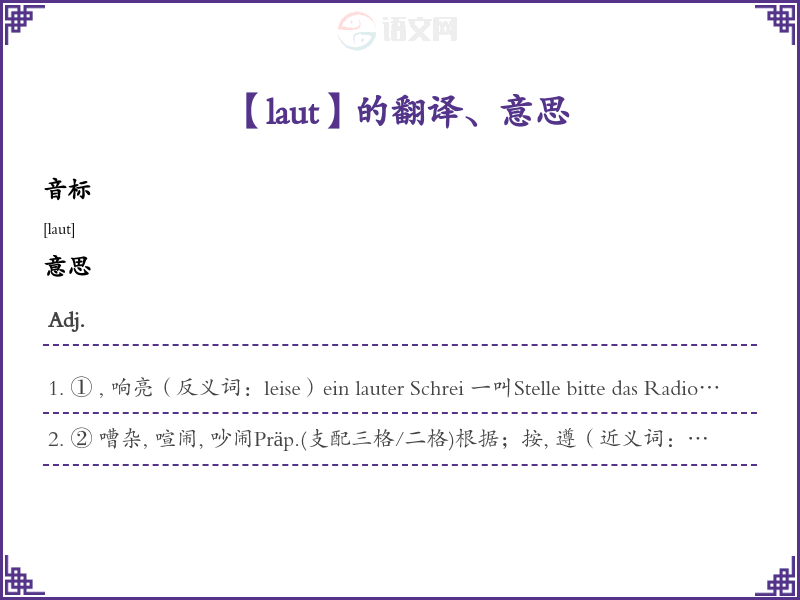 ② 嘈杂, 喧闹, 吵闹Präp.(支配三格/二格)根据;按, 遵(近义词: gemäß, nach Angabe von)laut Befehl 根据命令Laut ärztlichem Attest leidet der Patient am Gelbsucht.根据医生证明病人患了黄疸病。Laut Fahrplan müsste der Bus schon längst da sein. 按车时刻表公共汽车早该到了。