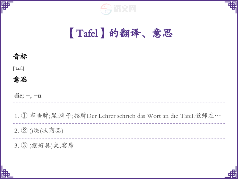 ① 布告牌;黑;牌子;招牌Der Lehrer schrieb das Wort an die Tafel.教师在黑字。