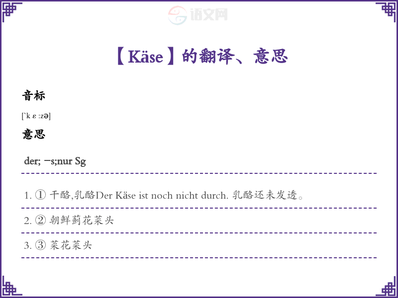 ① 干酪,乳酪Der Käse ist noch nicht durch. 乳酪还未发透。