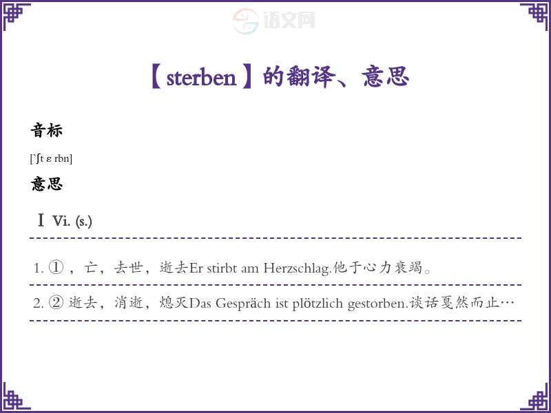 ① ,亡,去世,逝去Er stirbt am Herzschlag.他于心力衰竭。