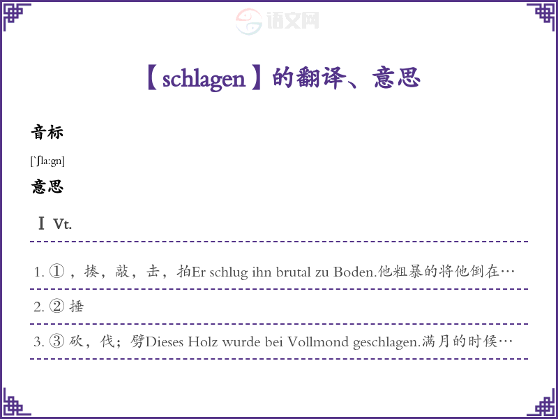 ④ 归属Ⅴ refl.坚持下来,经受得住,架,斗,相,影响某处,去, (千方百计)想得(或获取),夺,抢夺 [旧]决斗Die beiden schlagen sich schon wieder.这俩人又起来了。Ⅵ schlagend P.Ⅰ令人信服得;中肯得,确当的Ⅶ geschlagen P.Ⅱ