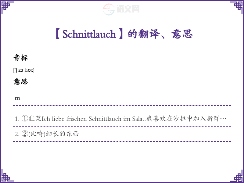 ①韭菜Ich liebe frischen Schnittlauch im Salat.我喜欢在沙拉中加入新鲜的韭菜。