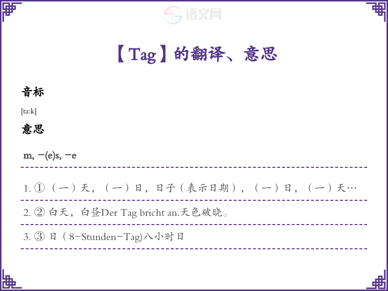 ① (一)天,(一)日,日子(表示日期),(一)日,(一)天(表示时间,即24小时)Im Laufe des Tages muss ich diese Arbeit erledigen.今天之内我必须完成。Wir vereinbarten Tag und Stunde unseres Wiedersehens.我们约定了再见的日期和时间。Rom wurde auch nicht an einem Tag erbaut.罗马也非一日建成。