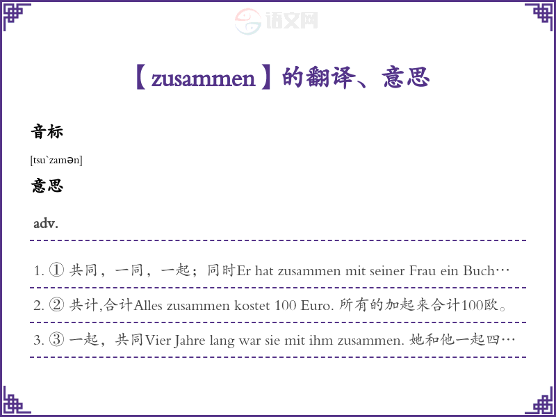 ① 共同,一同,一起;同时Er hat zusammen mit seiner Frau ein Buch geschrieben. 他和他妻子合写了一本书。