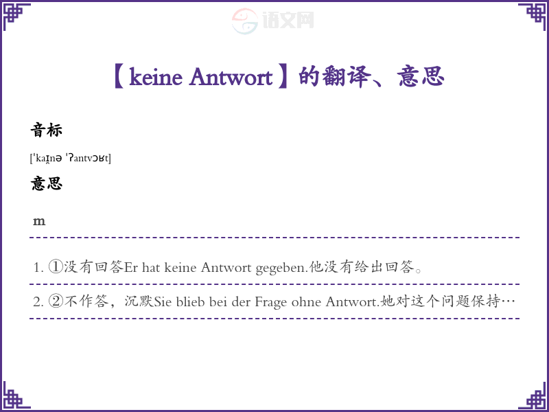 ②不作答,沉默Sie blieb bei der Frage ohne Antwort.她对这个问题保持沉默。