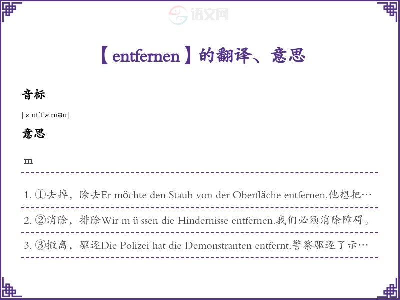 ①去掉,除去Er möchte den Staub von der Oberfläche entfernen.他想把表面的灰尘去掉。