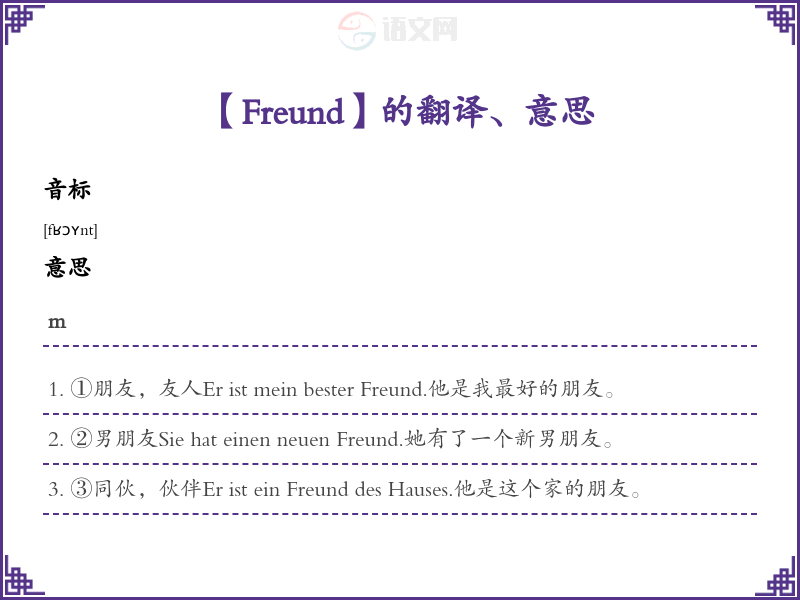 ①朋友,友人Er ist mein bester Freund.他是我最好的朋友。