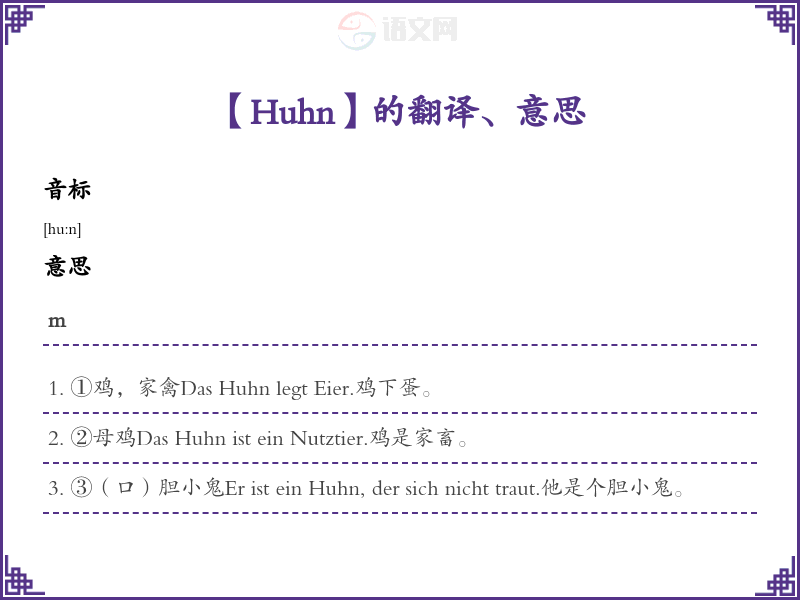 ①鸡,家禽Das Huhn legt Eier.鸡下蛋。
