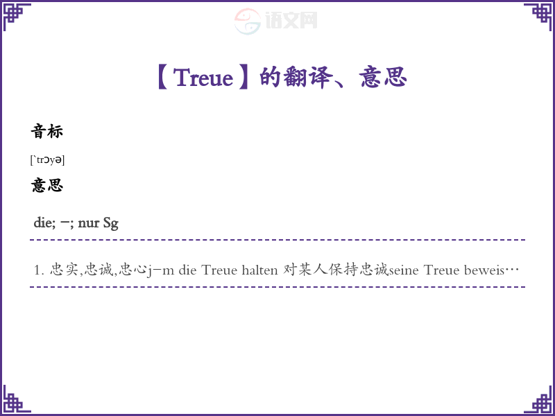 忠实,忠诚,忠心j-m die Treue halten 对某人保持忠诚seine Treue beweisen 证明自己的忠诚