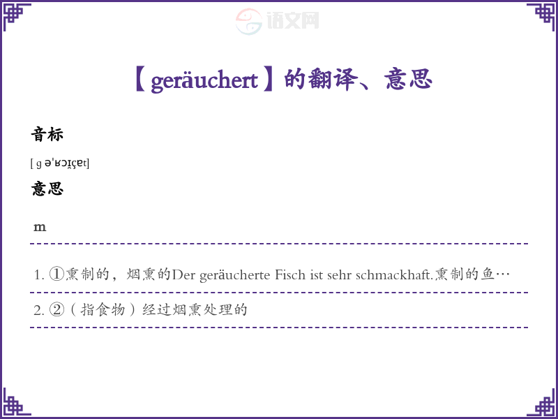 ①熏制的,烟熏的Der geräucherte Fisch ist sehr schmackhaft.熏制的鱼非常美味。