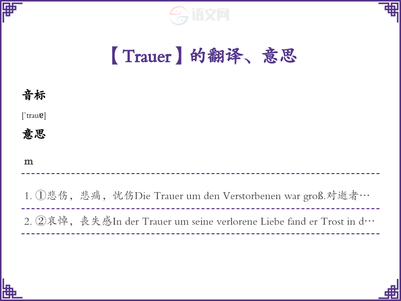 ①悲伤,悲痛,忧伤Die Trauer um den Verstorbenen war groß.对逝者的哀悼非常深重。