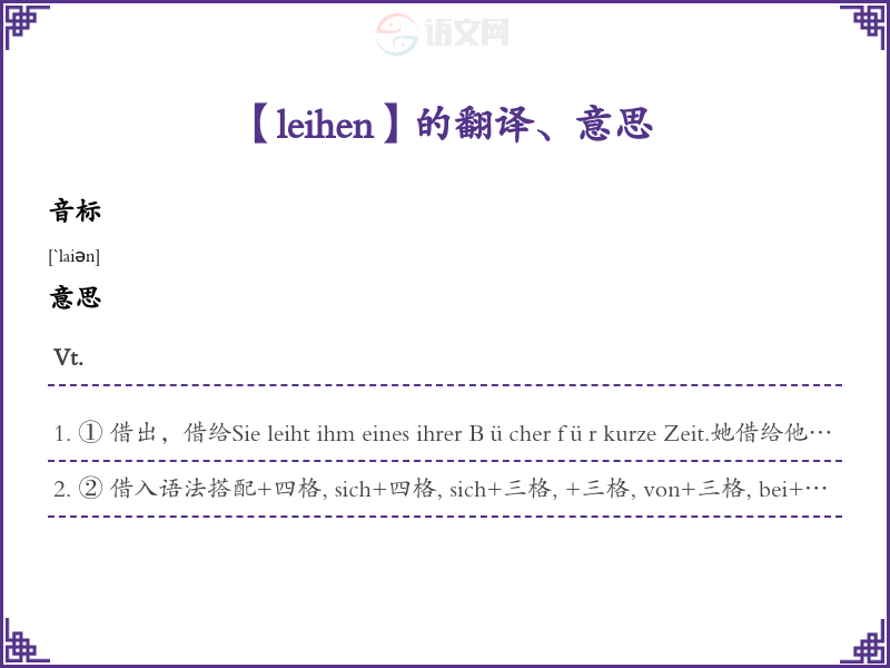 ① 借出,借给Sie leiht ihm eines ihrer Bücher für kurze Zeit.她借给他一本她的书一段时间。