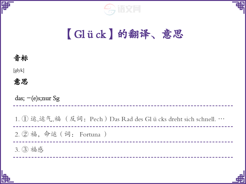 ① 运,运气,福 (反词:Pech)Das Rad des Glücks dreht sich schnell. 好景不长。Glück wie Glas, wie leicht bricht das. 福如玻璃,很容易破碎。Viel Glück im Neuen Jahr! 祝新年诸事吉利!Es war ein Glück, dass ich den Zug noch erwischt habe.总算运气,我赶上了火车。