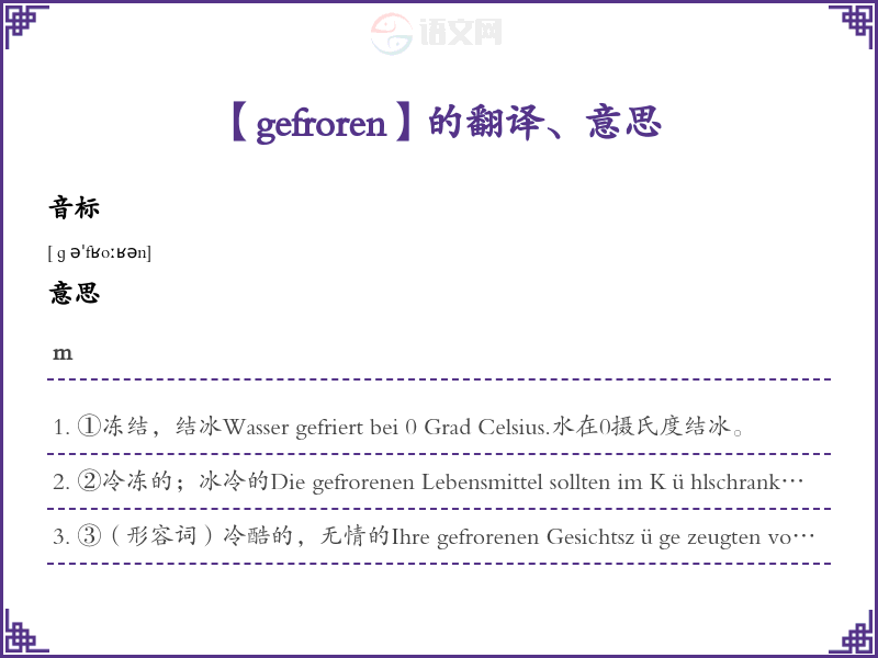 ②冷冻的;冰冷的Die gefrorenen Lebensmittel sollten im Kühlschrank aufgetaut werden.冷冻食品应在冰箱中解冻。