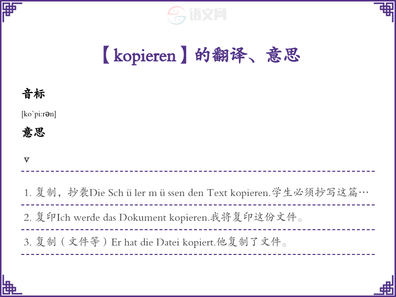 复制,抄袭Die Schüler müssen den Text kopieren.学生必须抄写这篇文章。