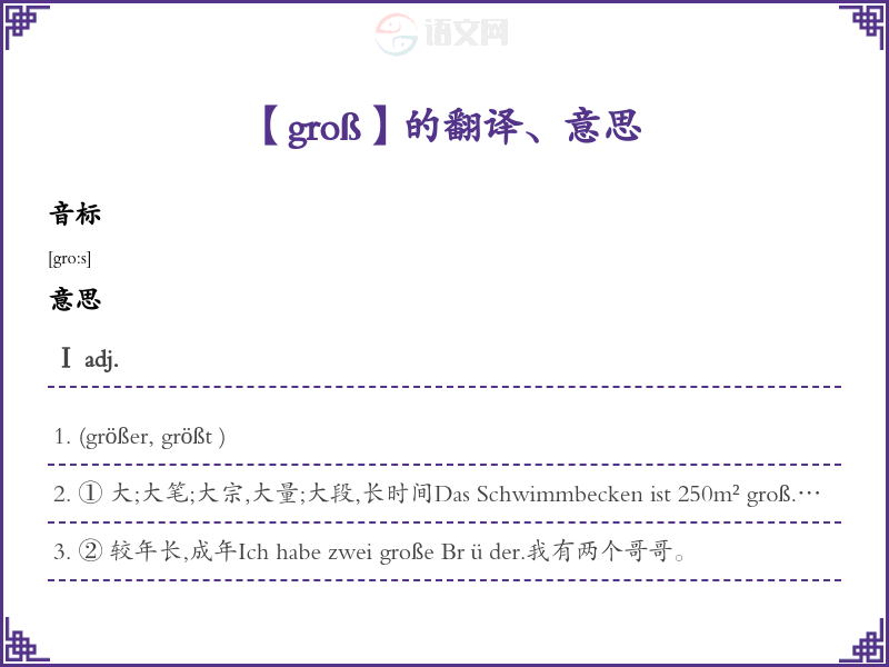 ① 大;大笔;大宗,大量;大段,长时间Das Schwimmbecken ist 250m² groß.泳池有250平米大。Mein Bruder ist einen Meter achtzig groß.我兄弟身高一米八。Der große Zeiger der Uhr zeigt die Minuten an, der kleine die Stunden.长钟,短小时。Der Elefant ist ein großes Tier.大象是一种很大动物。
