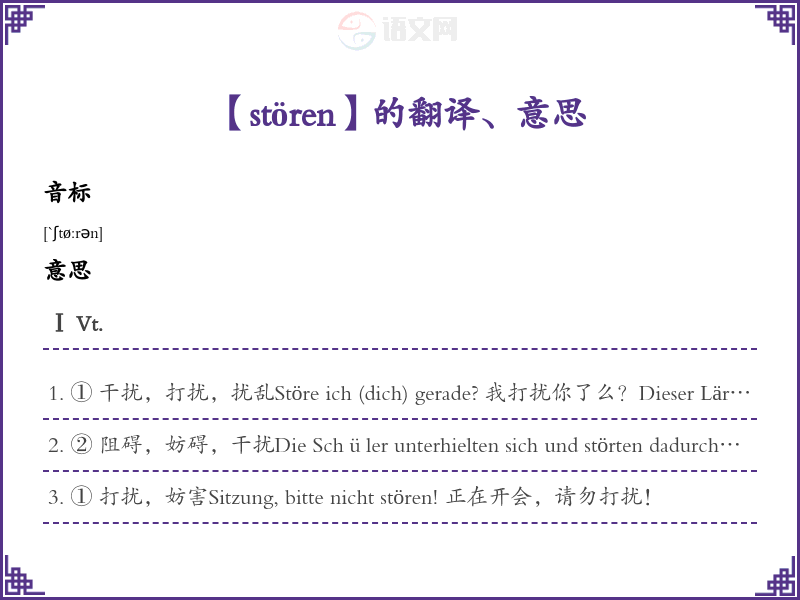 ① 干扰,打扰,扰乱Störe ich (dich) gerade? 我打扰你了么?Dieser Lärm stört mich bei der Arbeit.在我工作的时候,这噪音打扰到我了。
