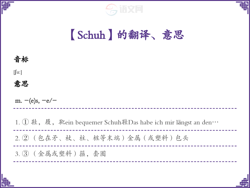① 鞋,履,靴ein bequemer Schuh鞋Das habe ich mir längst an den Schuhen abgelaufen.这个我早就有过经验(或领教过)了。