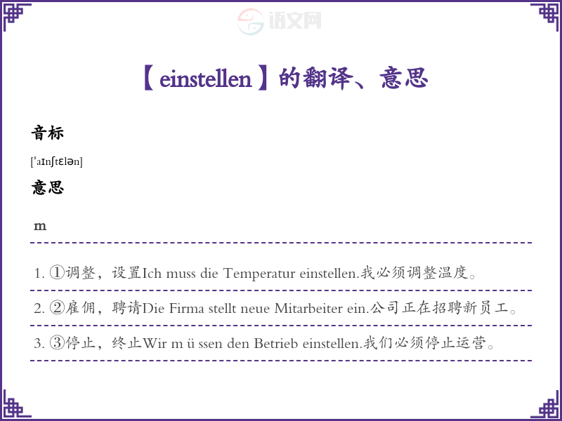 ①调整,设置Ich muss die Temperatur einstellen.我必须调整温度。