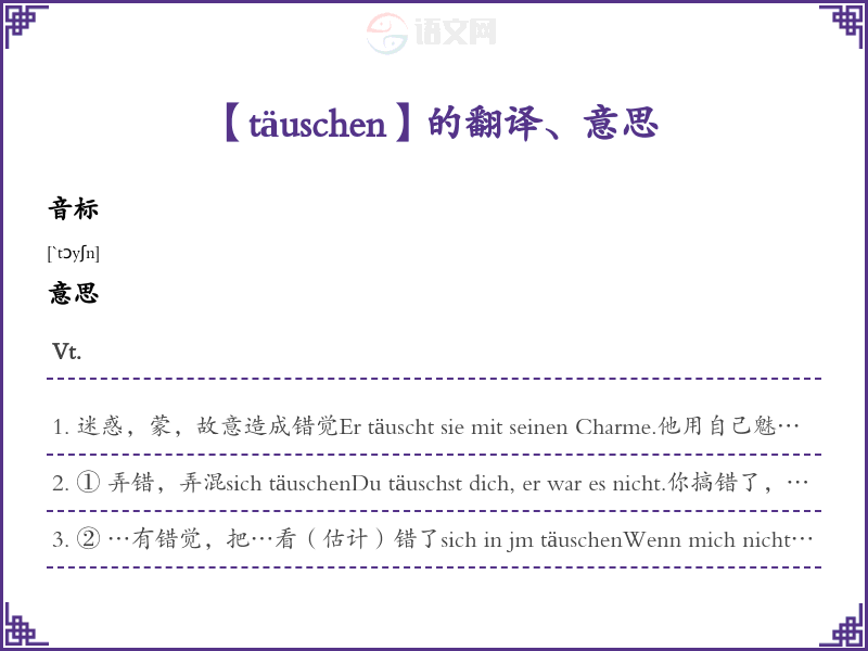 迷惑,蒙,故意造成错觉Er täuscht sie mit seinen Charme.他用自己魅力迷惑了她。Vi.(物主)把搞糊涂,让产生错觉Der ersteEindruck täuscht oft.第一印象常常让产生错觉。Vr.