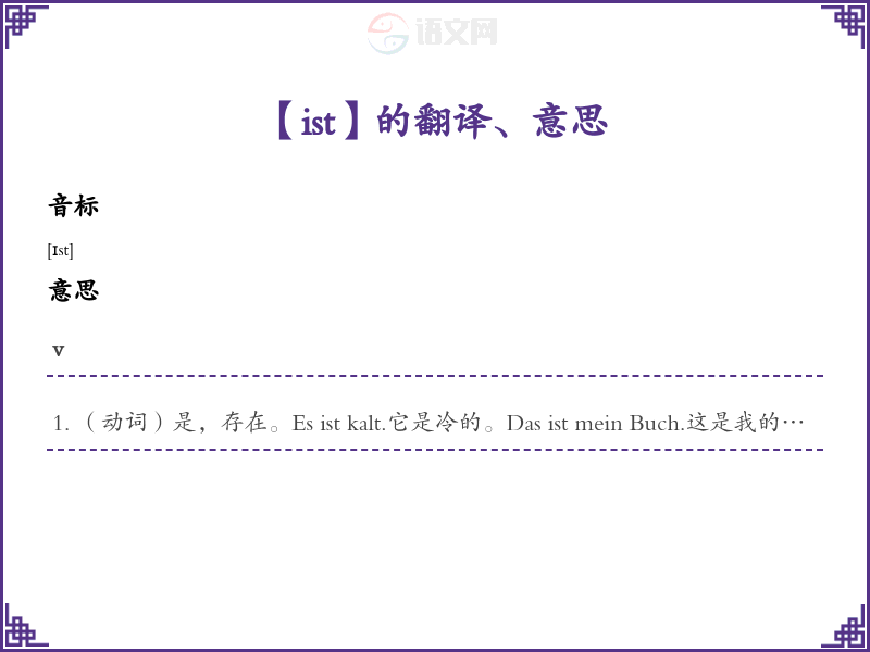 (动词)是,存在。Es ist kalt.它是冷的。Das ist mein Buch.这是我的书。