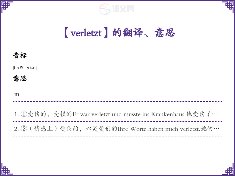 ①受伤的,受损的Er war verletzt und musste ins Krankenhaus.他受伤了,必须去医院。