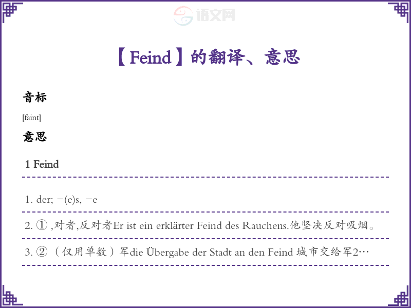 ② (仅用单数)军die Übergabe der Stadt an den Feind 城市交给军2 feindadj.[雅,旧]<只做谓语,与sein,bleiben,werden连用>对的,怀有意的;厌恶的只做谓语,与sein,bleiben,werden连用>