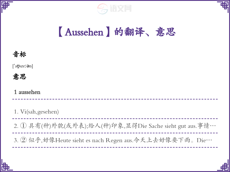 外貌,外观,神情ein gesundes Aussehen 健康的外貌Du solltest die Menschen nicht nach ihrem Aussehen beurteilen.你不该以貌取人.语法搭配+四格, mit+三格, nach+三格, für+四格, +als, +wie