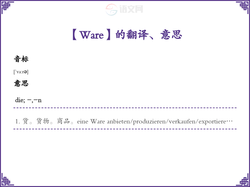 货。货物。商品。eine Ware anbieten/produzieren/verkaufen/exportieren 供应/生产/销售/出口一种商品die Waren mit dem Preisschild auszeichnen (用标价牌)给货物标价Gute Ware hält sich. [谚]好货耐用。(意指:身体健康,人不见老)Diese Ware ist ausgegangen. 这种货物已售完。