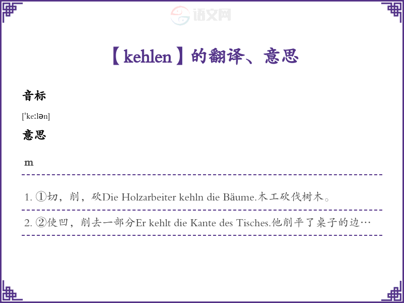 ②使凹,削去一部分Er kehlt die Kante des Tisches.他削平了桌子的边缘。