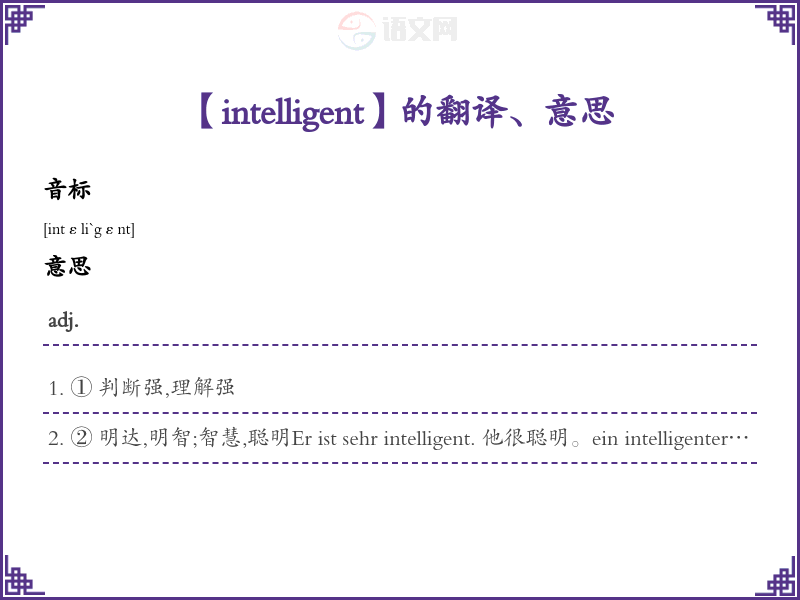 ② 明达,明智;智慧,聪明Er ist sehr intelligent. 他很聪明。ein intelligenter Mensch 一个聪明人
