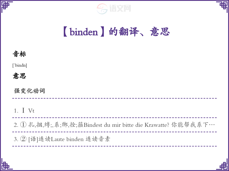 ② 合;有约sich an ein Mädchen binden 与一个姑有约语法搭配sich+四格, +四格, durch+四格, um+四格, an+四格, unter+四格, unter+三格