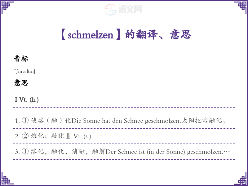 ① 使熔(融)化Die Sonne hat den Schnee geschmolzen.太阳把雪融化。