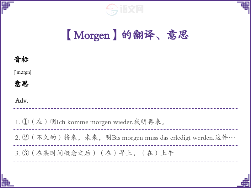 ②(不久的)将来,未来,明Bis morgen muss das erledigt werden.这件事到明必须办完。Das sind eure Aufgaben für morgen.这是你们明的任务。Das ist der Stil von morgen.这是未来的风格。