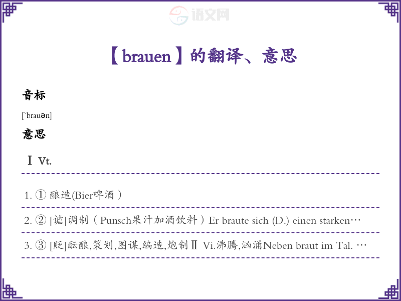 ③ [贬]酝酿,策划,图谋,编造,炮制Ⅱ Vi.沸腾,汹涌Neben braut im Tal. 山谷里雾气腾腾。语法搭配+四格