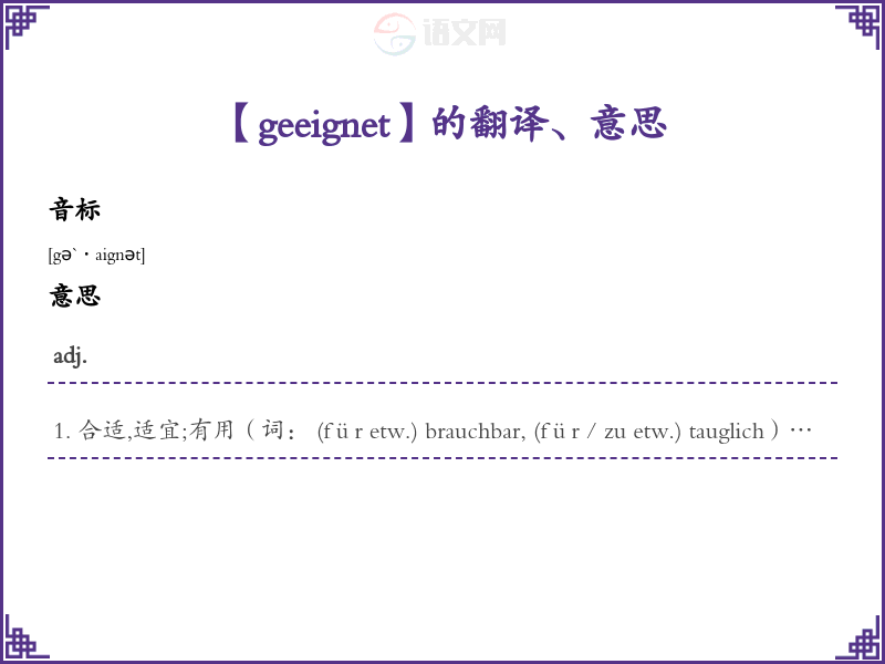合适,适宜;有用(词: (für etw.) brauchbar, (für / zu etw.) tauglich)Bücher sind immer als Geschenk geeignet.书作为礼物总是适宜。Sie ist für schwere Arbeit nicht geeignet. 她不适宜繁重工作。