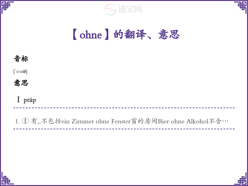 ① 有,,不包括ein Zimmer ohne Fenster窗的房间Bier ohne Alkohol不含酒精的啤酒ohne Besteck, nur mit den Fingern essen不用餐具而用手指吃饭Er ist ohne seine Frau in Urlaub gefahren. 他外出休假带夫人。Ohne Strom und Heizung zahlt er für seine Wohnung 800 Mark. 他在为他的住房交800马克的房租,电费和供暖除外。Ⅱ konj不...就,有...就Sie ging, ohne sich zu verabschieden.她说一声就走了。Sie hat uns geholfen, ohne es zu wissen / ohne dass sie es wusste.他在毫所知的情况下帮助了我们。Ohne dass ich was gesagt hätte, fing sie an zu weinen. 我还说啥,她就哭起来了。