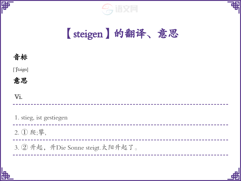 ④ 升高,升,涨Das Blut steigt ihm ins Gesicht.血涌他的脸。Der Duft der angebratenen Zwiebeln stieg ihr in die Nase.煎洋葱的香味传入了她的鼻子。