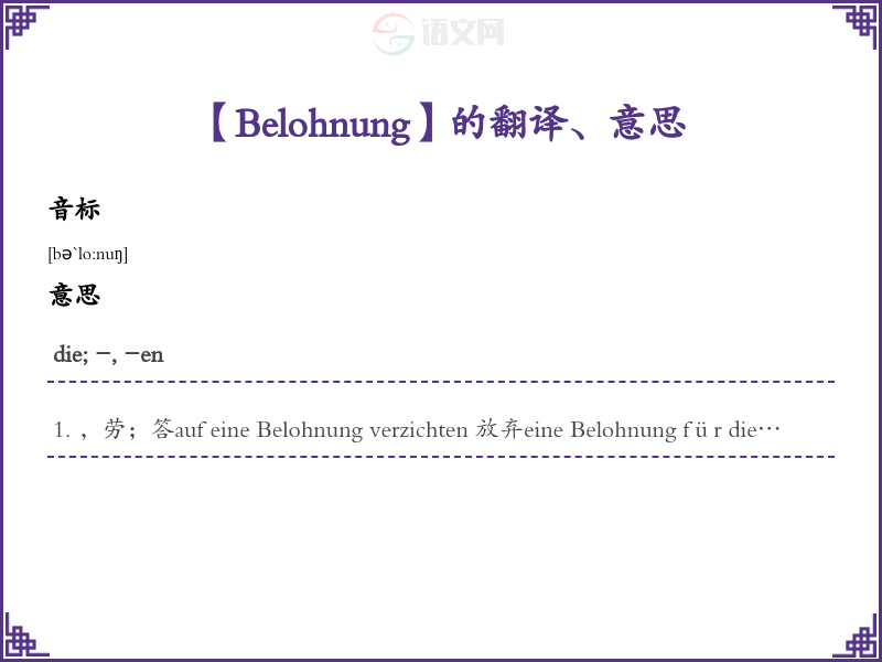 ,劳;答auf eine Belohnung verzichten 放弃eine Belohnung für die Aufklärung eines Verbrechens aussetzen悬赏查明罪行als Belohnung (或 zur Belohnung) für etw. 作为对某事的