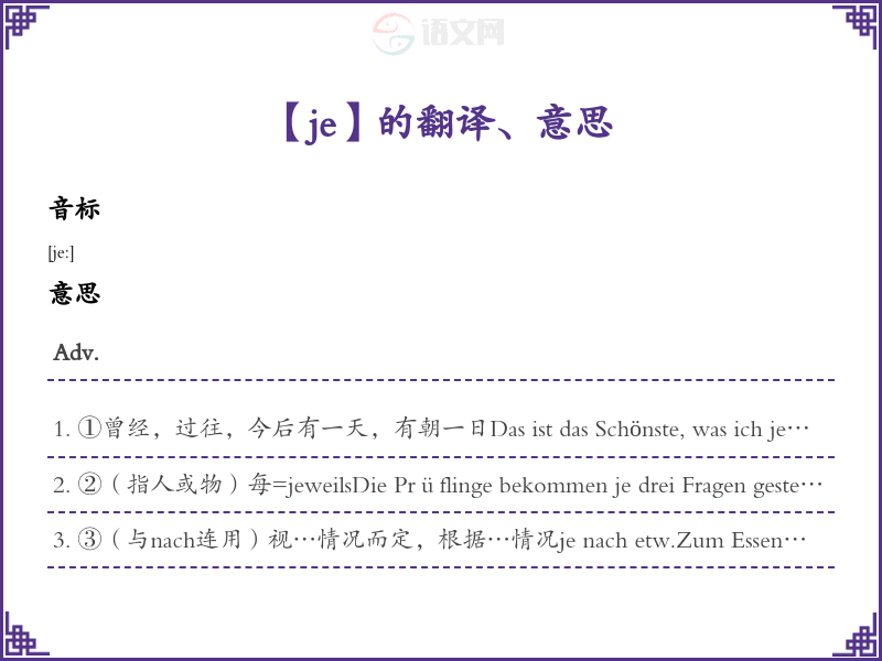 ①曾经,过往,今后有一天,有朝一日Das ist das Schönste, was ich je gehört habe.这我曾听说过的,最美妙的事。