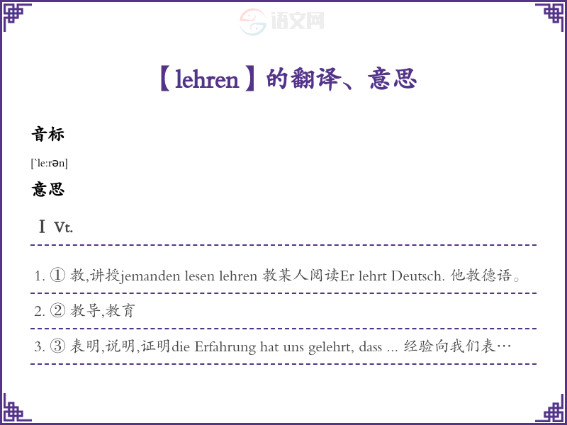 ③ 表明,说明,证明die Erfahrung hat uns gelehrt, dass ... 经验向我们表明...Ⅱ Vi.教书。教课。an der Universität lehren 在大学里教书in den oberen Klassen lehren 在高年级教书语法搭配+四格, +三格