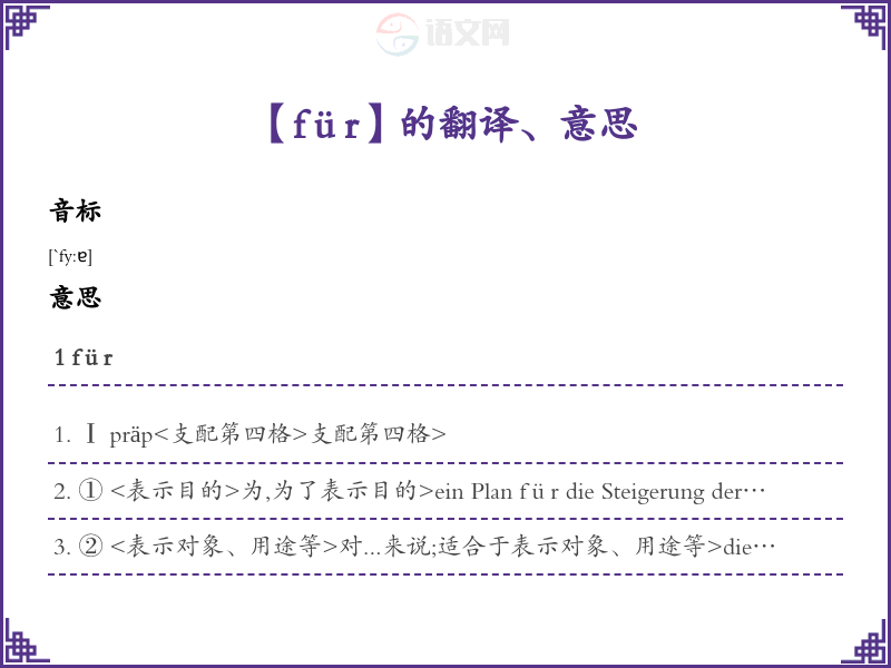 ⑩ <>Schritt für Schritt seinem Ziel näherkommen 逐步地接近目标Stueck für Stueck untersuchen 逐件检查Tag für Tag 日复一日,一天天einen Text Wort für Wort übersetzen 逐字逐句地翻译一篇文章Mann für Mann trat vor. 一个挨着一个出列。⑾<表示可能性>表示可能性>Nimm für alle Fälle etwas Geld mit! 带点钱去,以防万一!Für den Fall, dass es regnet... ...以防下雨⑿<与was构成固定搭配:was für="" (ein,="" eine,="" ein)...=""> →was I与was构成固定搭配:was>⒀<受某些动词、形容词的支配>受某些动词、形容词的支配>j-n/etw. eintreten 为某,某事辩护etw. für richtig halten 认为...正确sich für etw. Interessieren 对...有兴趣für etw. kämpfen 为某事而斗争für j-n/etw. sorgen 关心某/某事Genug für heute! 今天就到这儿!Ⅱ adv.[诗]永久,永远2 Fürdas赞成,拥护