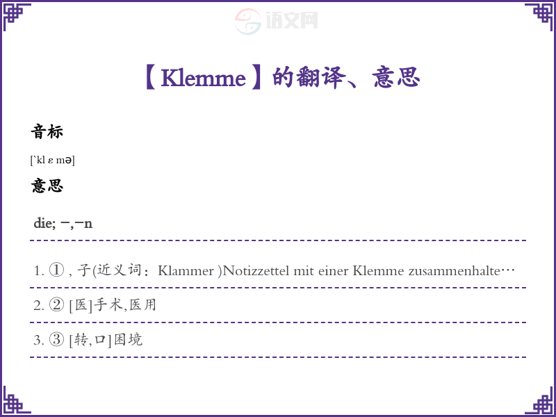 ① , 子(近义词:Klammer )Notizzettel mit einer Klemme zusammenhalten用子把记事便条在一起Haare mit einer Klemme befestigen 用子把头发在一起