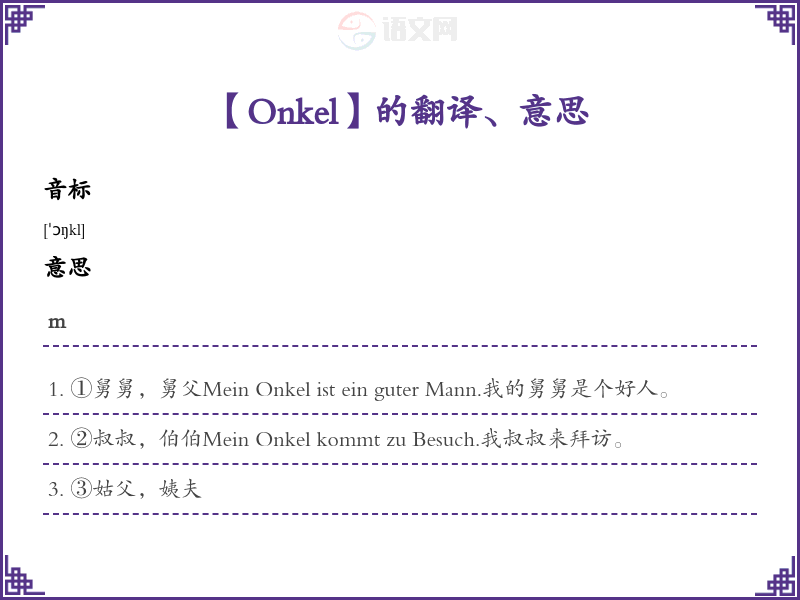 ①舅舅,舅父Mein Onkel ist ein guter Mann.我的舅舅是个好人。