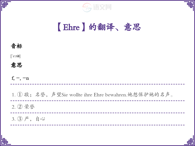 ① 敬;名誉,声望Sie wollte ihre Ehre bewahren.她想保护她的名声。